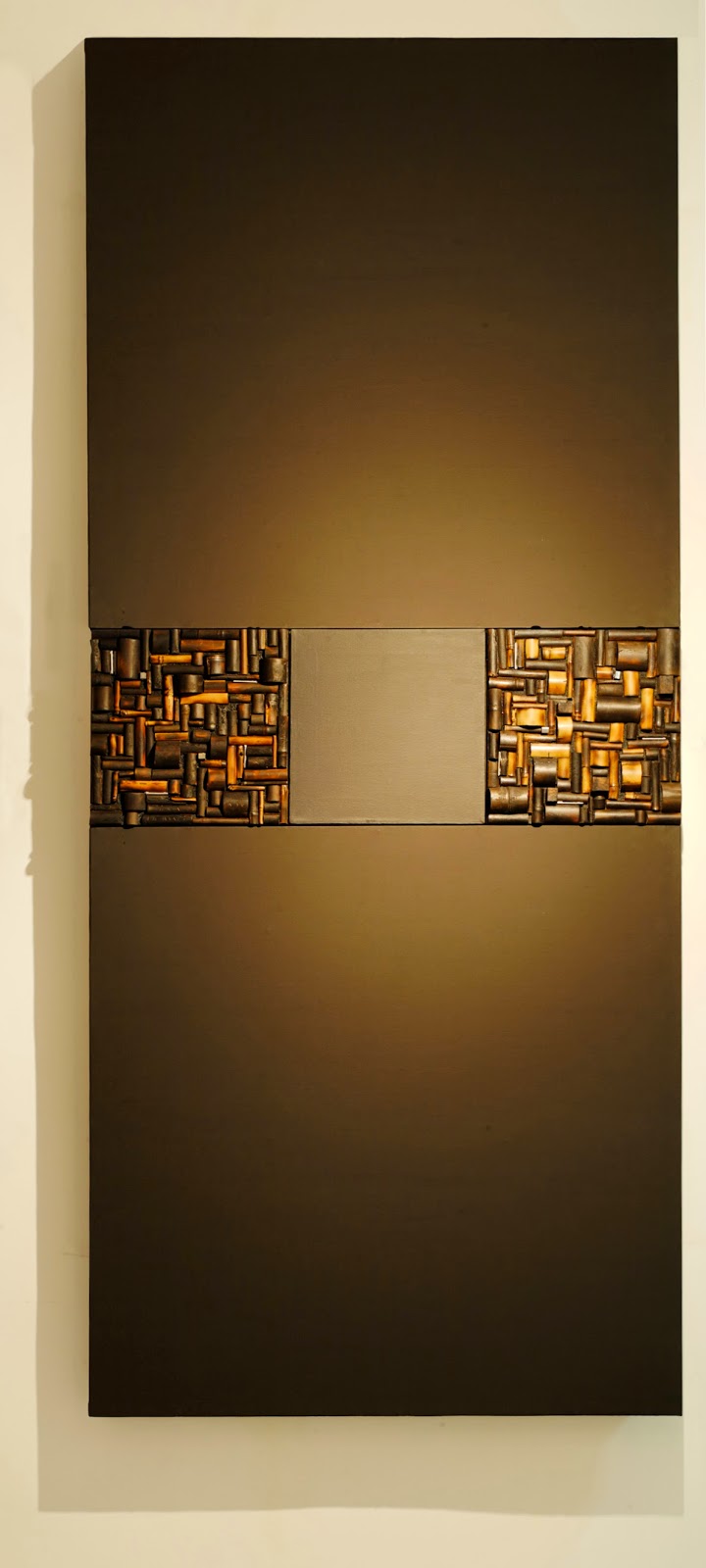 I still have vivid recollections of that day at the Fotanian Open Studios. Feasting my eyes on studio after studio of refreshing and invigorating art works thrilled me through and through. At the height of all this exhilaration, I stepped into the studio of the late artist Jerry Kwan and found myself face to face with a riveting installation that put the commotion inside of me to a sudden halt. Entitled Illusion, the installation by Lucille consists of long dark panels hanging side by side on the unpainted wall. Three of the panels are neatly inlaid with small squares from top to bottom. Close up, the squares reveal themselves to be in a harmonious mixture of grey, black, brown, green, blue, yellow and orange that are subdued and archaistic but by no means dull or dreary. From a distance, seven bigger squares can be made out from each of the three columns of small squares. Attractive and tonally different, they seem to be complementing one another while holding their own positions in that vast dark space. Extending onto the floor are three neat columns of dark panels placed end to end, each surmounted by two golden bowls. Both evenly spaced, the glittering bowls contrast starkly with the dark panels. Whatever tension that should have arisen from such contrast is neutralized by the sense of order exuding from the piece as a whole, suggesting solemnity rather than flamboyance. Static and serene, the work speaks in a medium and with a visual language that are Western and modern and yet the aesthetics embodied is purely oriental.
